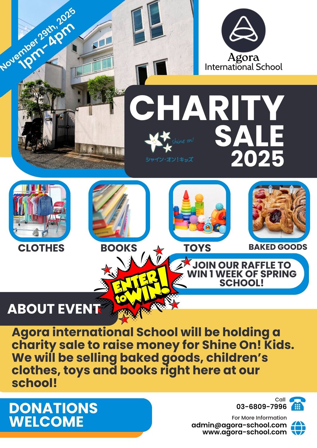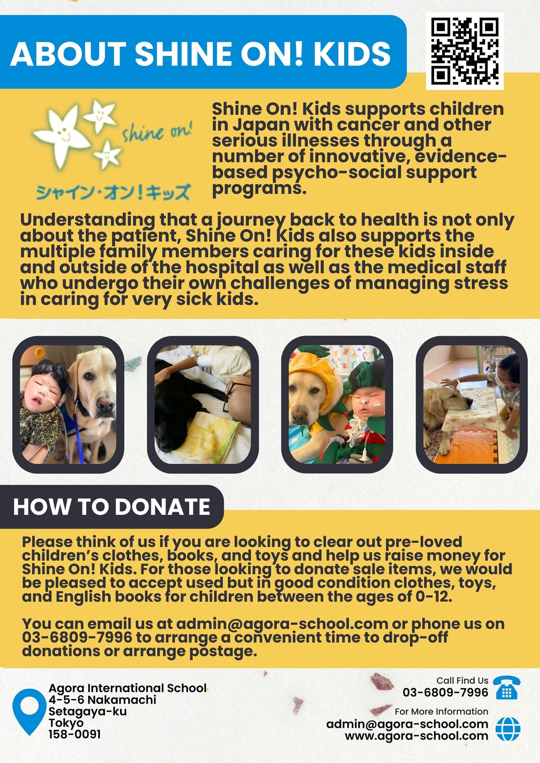 Join us at Agora International School’s Charity Sale on November 29th, 2025, and make a meaningful difference in the lives of children supported by Shine On! Kids. Whether you come to shop for great finds—clothes, toys, books, and delicious baked goods—or simply wish to donate pre-loved items, every contribution helps fund vital programs for children in Japan facing serious illnesses. Enjoy a warm community event, take part in our exciting raffle for a chance to win one week of Spring School, and know that your support directly brings comfort, joy, and strength to families who need it most. Your generosity can brighten a child’s journey—join us or donate today!